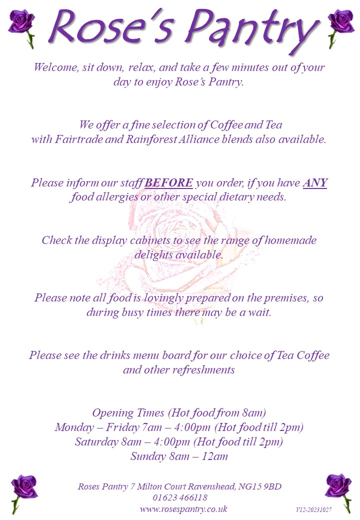 Welcome to Roses Pantry, a delightful café nestled in the heart of Ravenshead, Nottingham. This charming spot, located at 7, Milton Court, beckons with a menu that spans Breakfast, Lunch, and Afternoon Tea, catering to a variety of tastes and occasions.